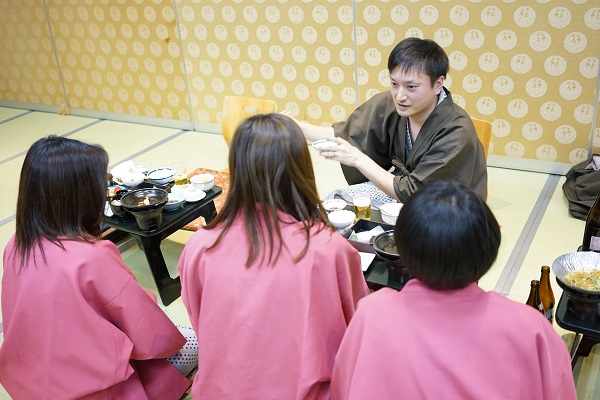 と~くいげに講釈を垂れる山岸取締役と真剣に話をきく女性スタッフ達。