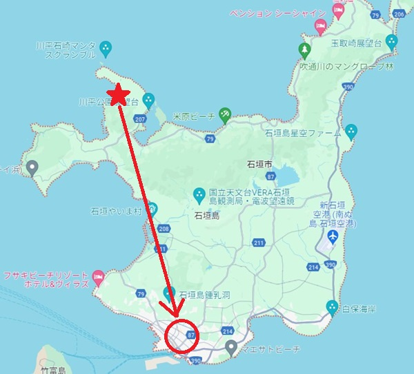 石垣島の地図で見るとホテルが左上で市街地が下の方でホテルからだいたい20キロ程ですね。